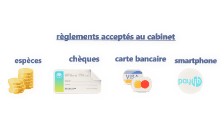 * Modes de règlement acceptés au cabinet : espèces, carte bancaire, chèque |