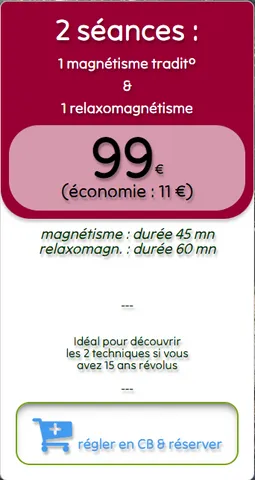Vous hésitez sur le type de séance, entre magnétisme traditionnel et relaxo-magnétisme votre coeur balance. Vous pouvez tester les 2 à un prix avantageux. Chaque type de séance à ses atouts, le magnétisme traditionnel peut suffire le plus souvent mais le relaxo-magnétisme, vous impliquant davantage en sollicitant votre insoupçonnable capacité de visualisation, vous rend acteur de votre processus de mieux-être.